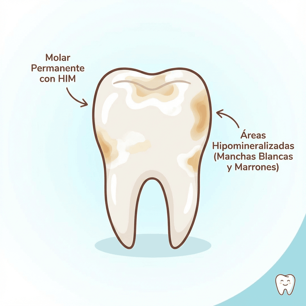 De repente, un día miras la boca de tu hijo y notas algo raro: un diente “nuevo” (de los definitivos) tiene una mancha blanca, amarillenta o marrón. A veces parece tiza; otras, parece que el esmalte está “apagado”. Y lo más desconcertante es que, sin caries visible, el niño se queja: “me duele con el frío”, “me molesta al cepillar”, “no puedo morder ahí”. Si esto te suena, puede que estemos ante la Hipomineralización Incisivo-Molar, conocida por sus siglas: MIH.