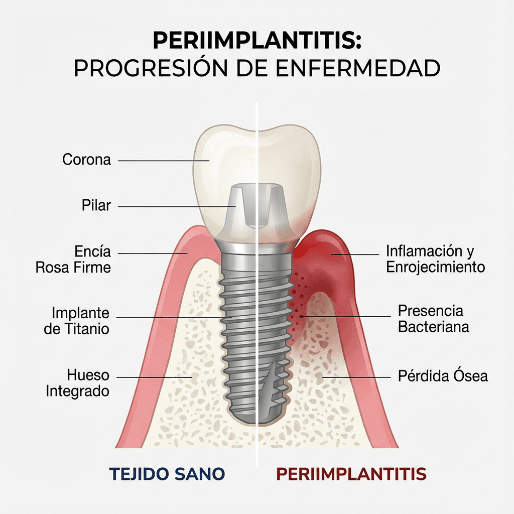 pérdida de hueso alrededor del implante. Es decir: el soporte del implante se ve afectado. En este punto, el objetivo clínico no es “que se vea menos rojo”, sino detener el avance, descontaminar la zona y, cuando sea posible, recuperar parte del soporte.